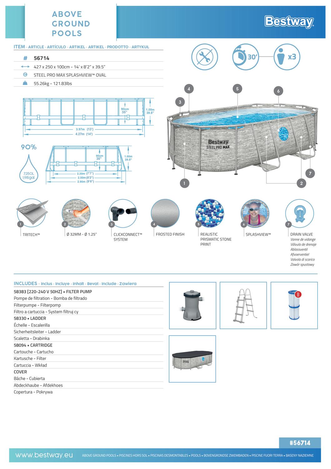 • Contenido: una piscina, bomba de filtro, escalera, cobertor, dosificador químico ChemConnect y parche de reparación autoadhesivo subacuático